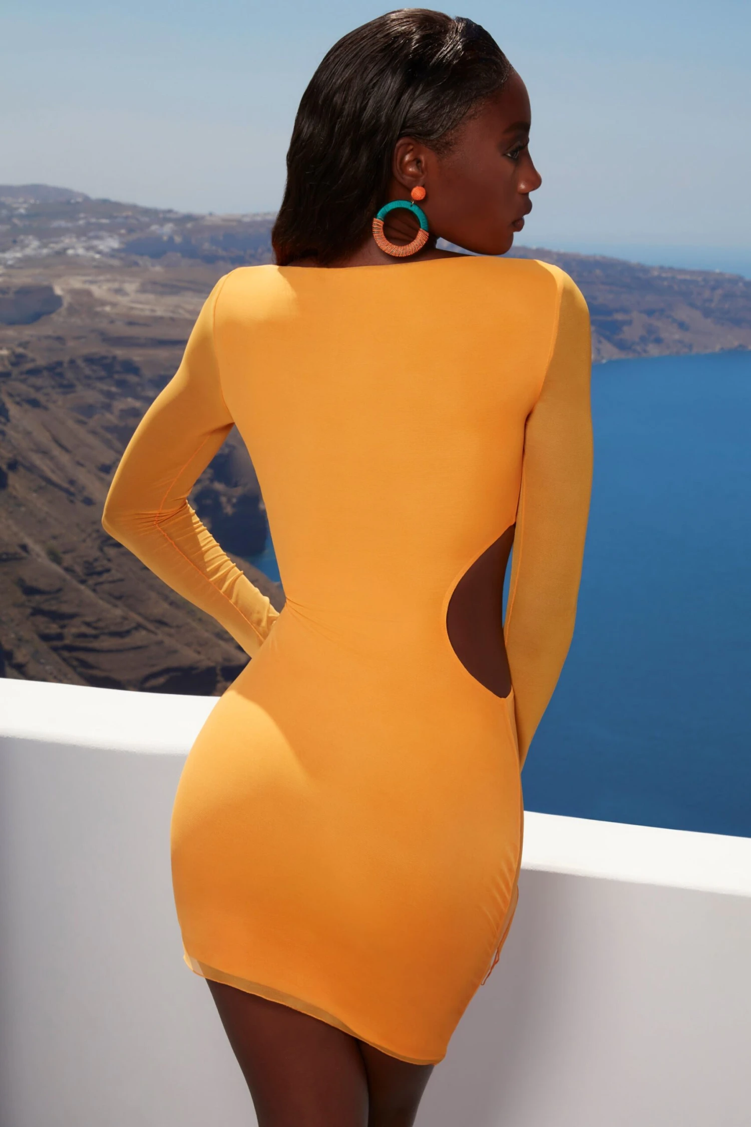 After long beach days, youโll wanna get all dressed up in our bodycon mini dress, babe. Designed in double-layered stretch mesh, this mini dress features an asymmetric neckline and hemline with side cut-out detailing in a sculpting body-hugging fit. Ultra-long sleeves are designed in transparent mesh, falling past your hands for a trend-led look. This mini dress is the perfect piece to throw on with strappy sandals and statement earrings for an effortless โfit.
