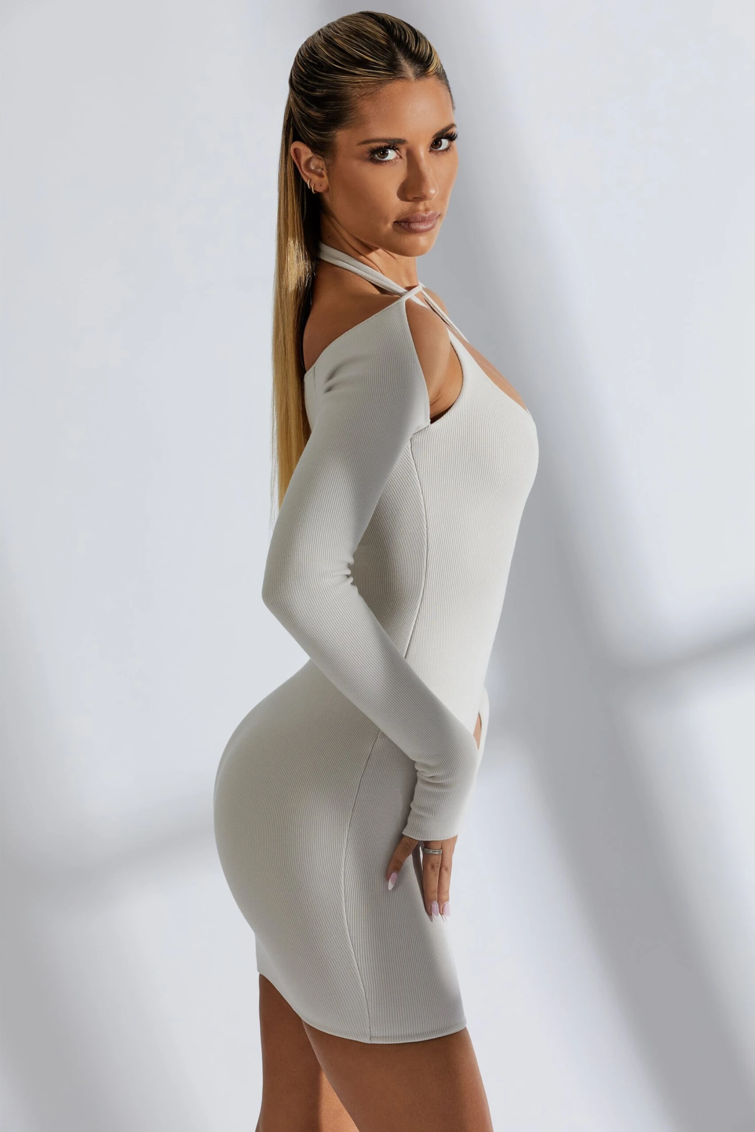 Project your cool girl aesthetic in Focused On Me, our all new double layered mini dress cut from our signature ribbed, modal fabric. Designed to flatter your figure, Focused On Me is tight cut to the body and features extra long sleeves that finish just before the fingertips and include an on trend thumb hole. Featuring a bust flattering halter neckline with an eye-catching adjustable thin strap that runs along the chest and forms two bardot sleeves, Focused On Me is all about the details. Understated and versatile, this bardot mini dress can be worn with trainers or heels, depending on your vibe.