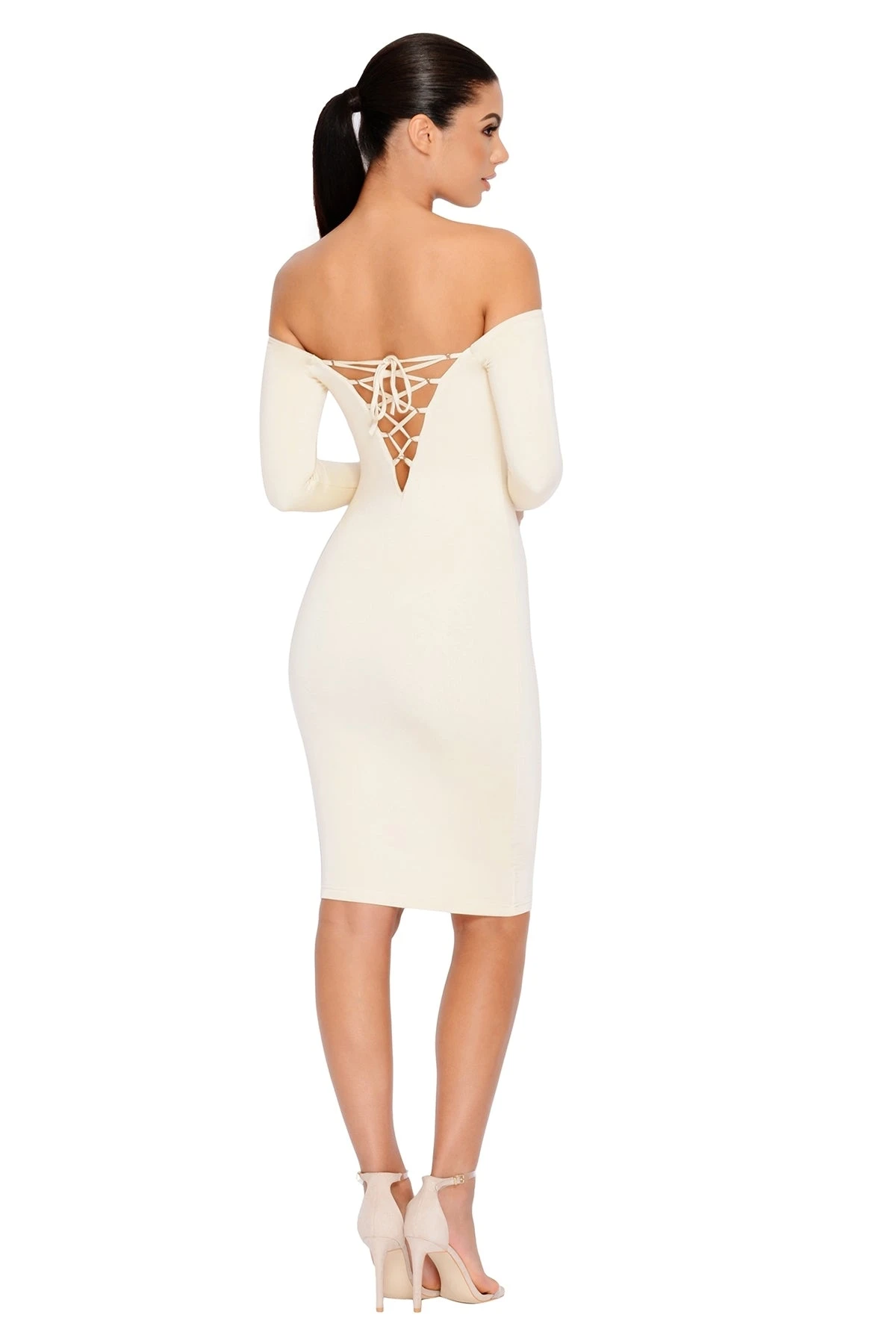 Stay sleek with our super soft double-layered fabric, designed to give the figure a smooth and sculpted appearance. Bare Enough is a midi length dress with an off-the-shoulder Bardot style and long sleeves.ย