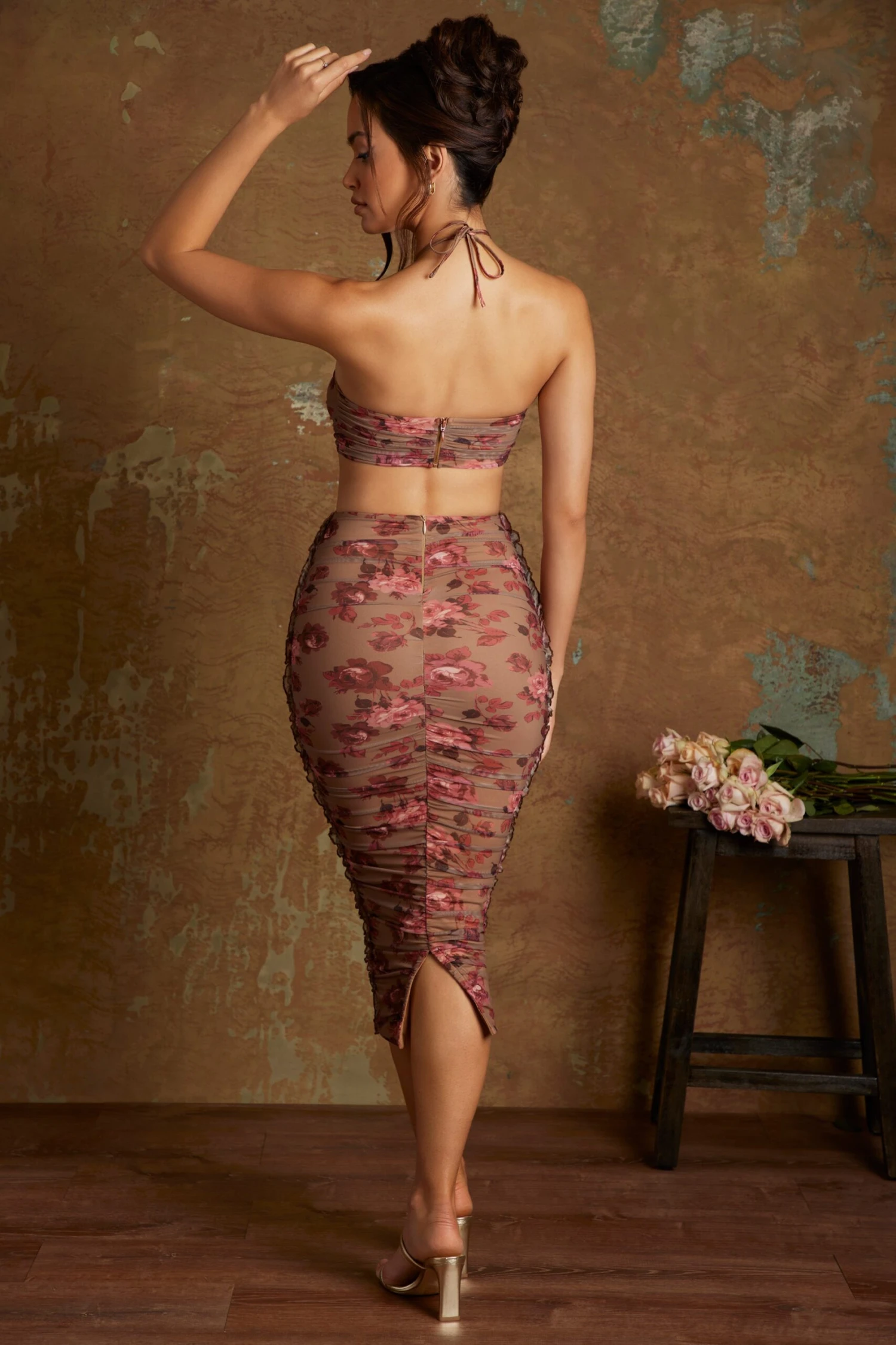 Nothing says romance more than florals and the Aergul midaxi dress is a statement design made for falling in love. Cut from our super soft jersey fabric with a semi sheer mesh overlay, Aergul features an angled bandeau neckline with a self tie halter neck fastening and statement floral decoration. Fully ruched to ensure a flattering silhouette, Aergul is complete with waist cinching side cut outs and delicate frill detailing that adds a romantic finishing touch.