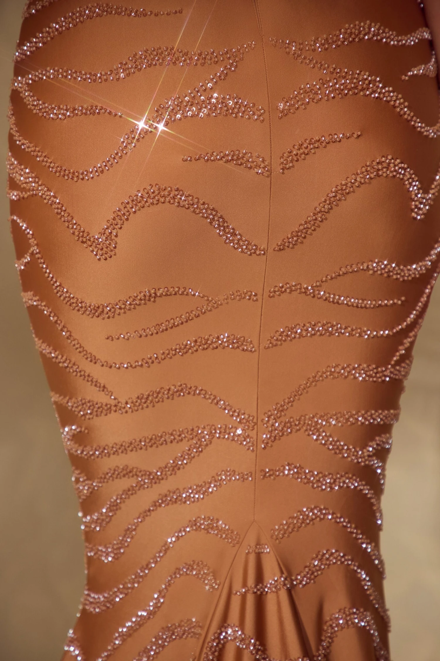 The ultimate occasion dress, Blaize is a sensual and seductive evening gown designed to captivate the room. Powerfully sexy, Blaize has a bust flattering scoop neckline and cascading fishtail hem that creates an alluring hourglass figure. Designed in our supersoft, figure hugging Lycra fabric, Blaize is heavily embellished with delicate beading in a timeless zebra print.