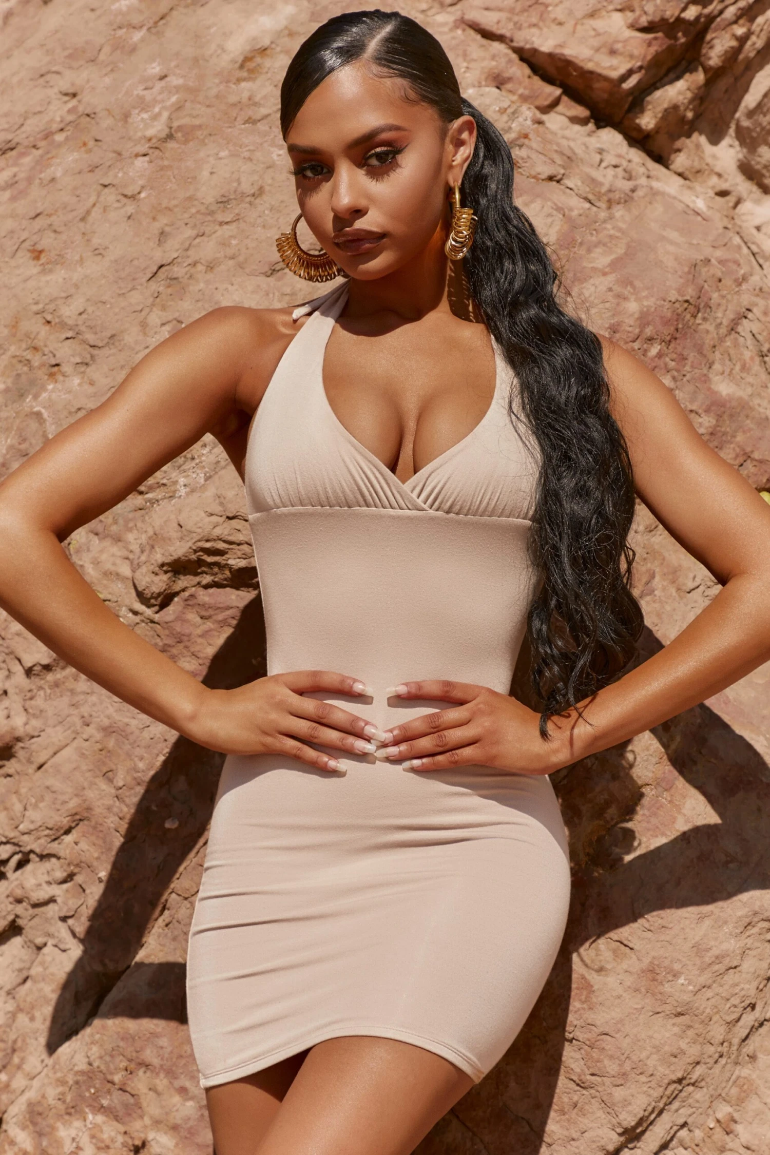 Sculpting your figure for that dreamy shape, our plain mini dress is designed in our deliciously soft double-layered fabric. Featuring halter neck straps and a bust-flattering wrap front, our sleeveless bodycon dress is all about simplicity. Itโs a wrap, babe, youโve found the one.