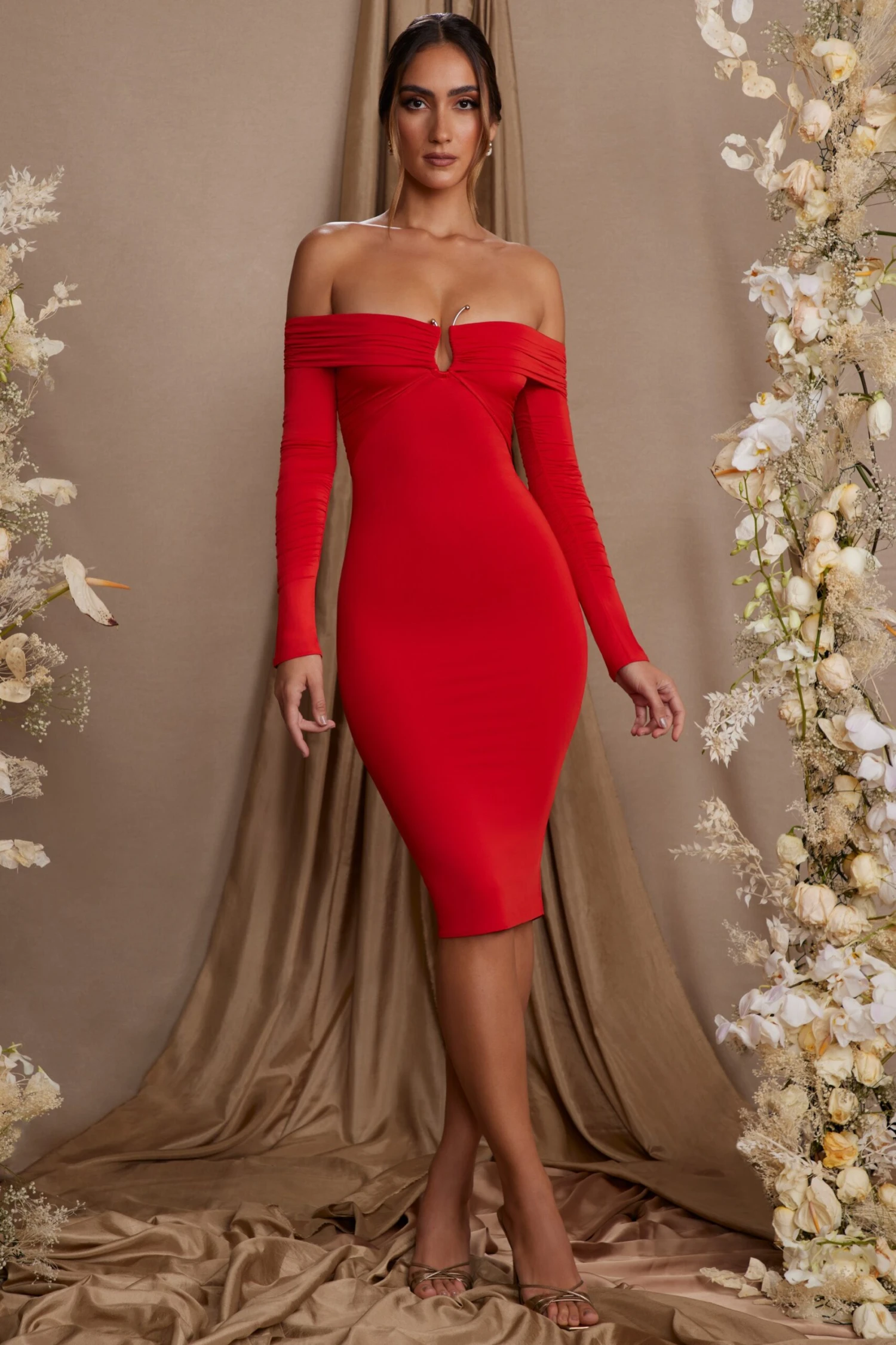 Glamorous and elegant, the Brigitte midi dress is a classic style designed to create the most seductive silhouette. Designed in our premium stretch jersey fabric that embraces your curves like a second skin, the Brigitte midi dress features a decolletage bardot neckline with statement hardware detailing at the bust. Complete with ruched paneling at the bodice creates the illusion of a cinched waist, it’s time to fall effortlessly in love with Brigitte.Â