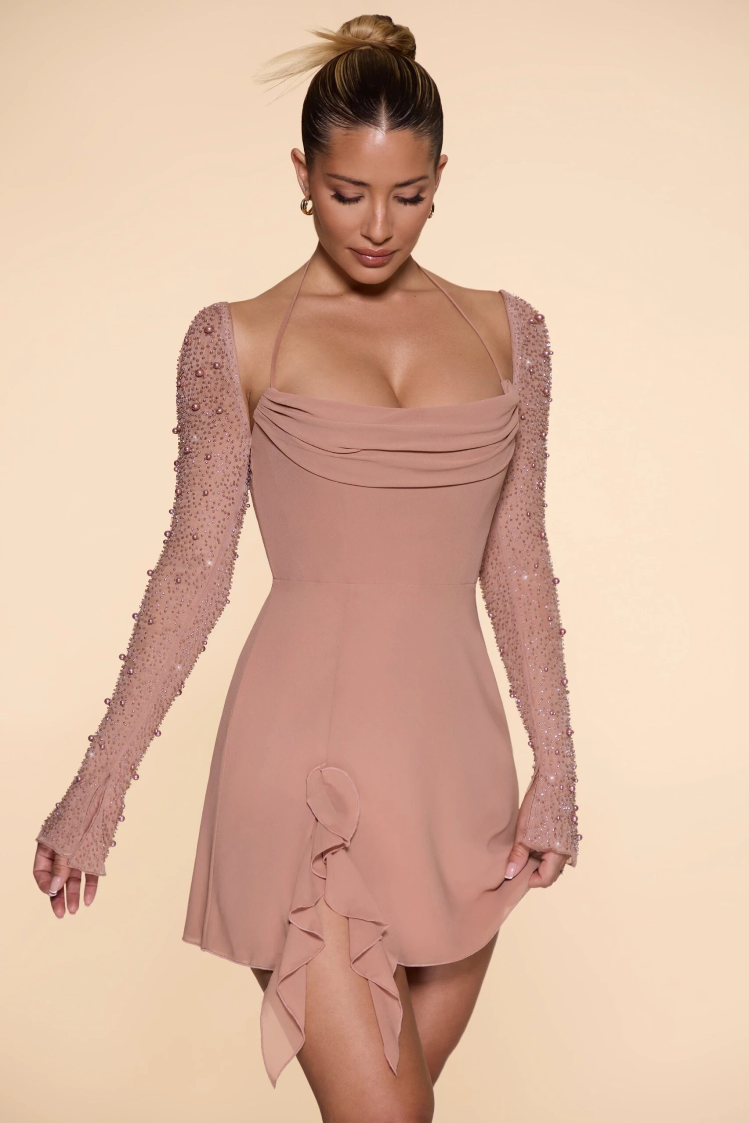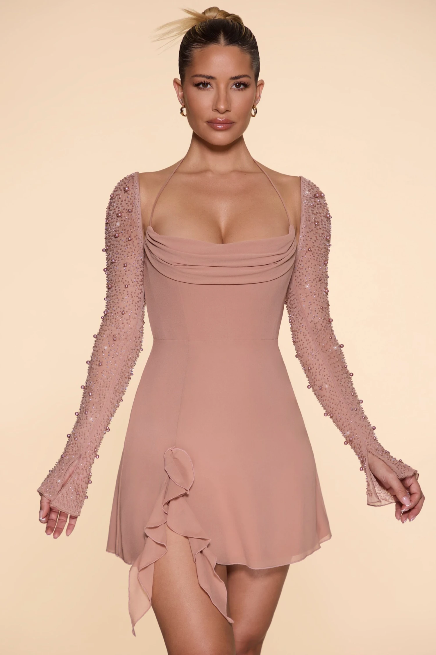Delicate and feminine, the Florence mini dress was designed to captivate attention. Designed in our whimsical georgette fabric with full length mesh sleeves hand embellished with pearl and bead adornment, Florence is a romantic style perfect for elegant date nights. The bust flattering, pleated cowl neckline is accentuated with dainty self tie halter neck straps whilst the curve skimming, a-line mini skirt features romantic ruffle detailing at the thigh. All about the finer details, the Florence mini dress is compete with a seductive open back with criss-cross straps creating a caged effect.ย