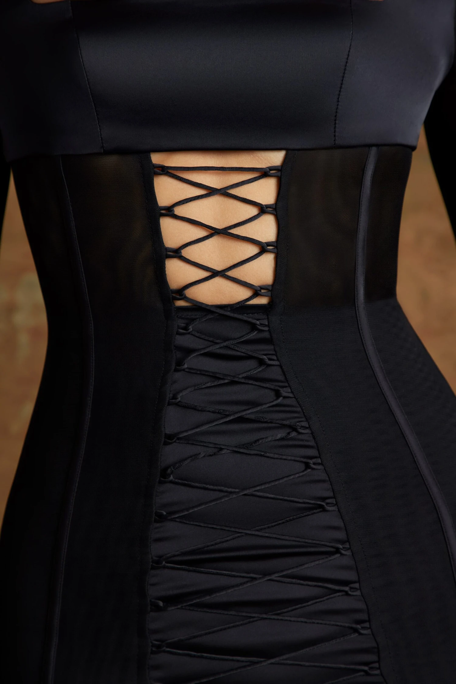 Lace up detailing and satin paneling have us falling head over heels for Belkis. Designed in a combination of semi sheer mesh and glamorous satin fabrics, Belkis is a long sleeve design with statement open bodice enhanced with seductive lace up detailing. Semi sheer long sleeves that flare at the wrist complete this bewitching look.Â