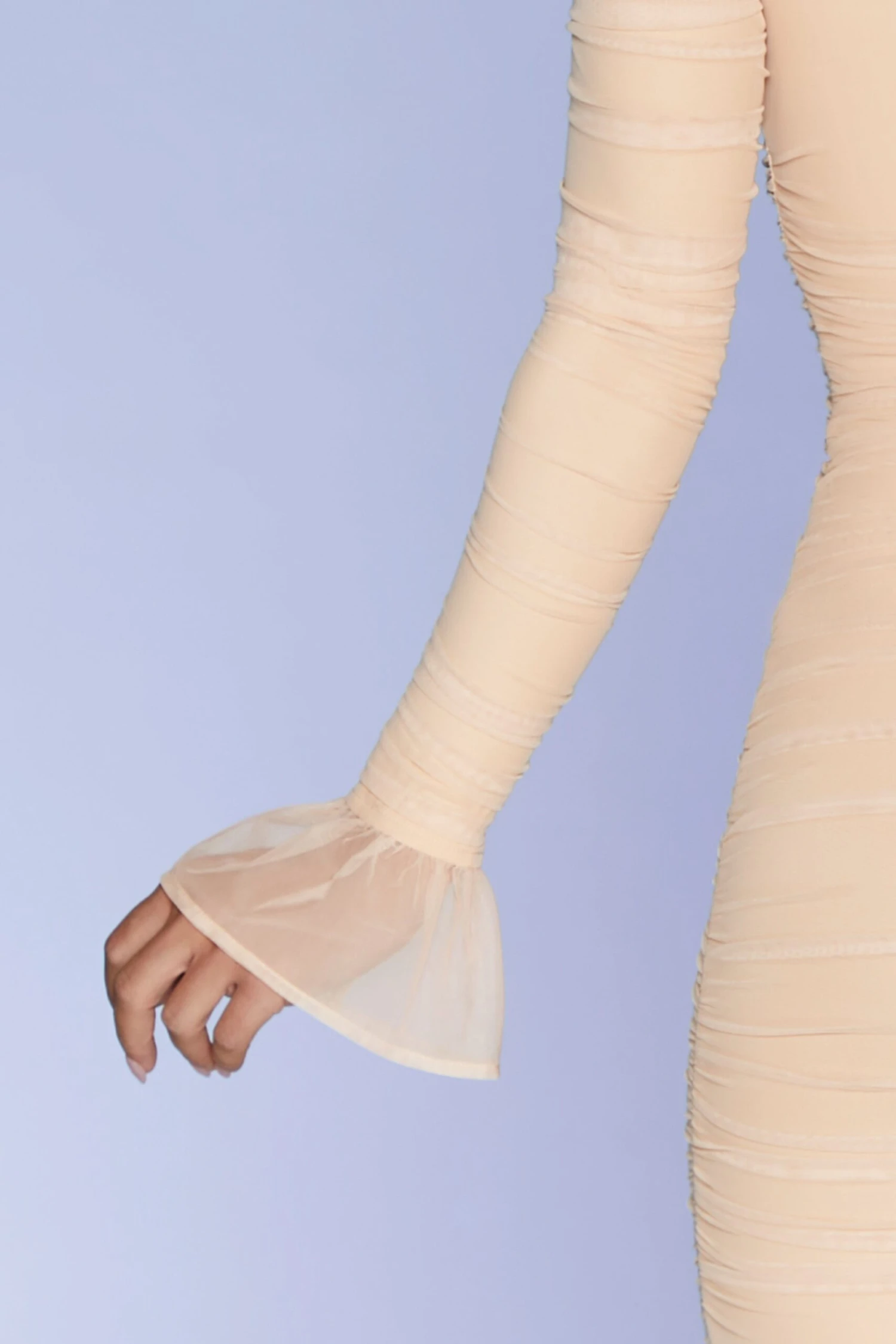 Romantic and alluring, the True For You mini dress is perfect for your next enchanting date night. Cut from our body accentuating stretch mesh fabric, True For You features full body ruching that creates an undeniably enviable silhouette. Complete with elegant long sleeves with delicate frill detailing, True For You also features underwired criss-cross cups with subtle underbust cut out that adds an edge to this pretty mini dress.