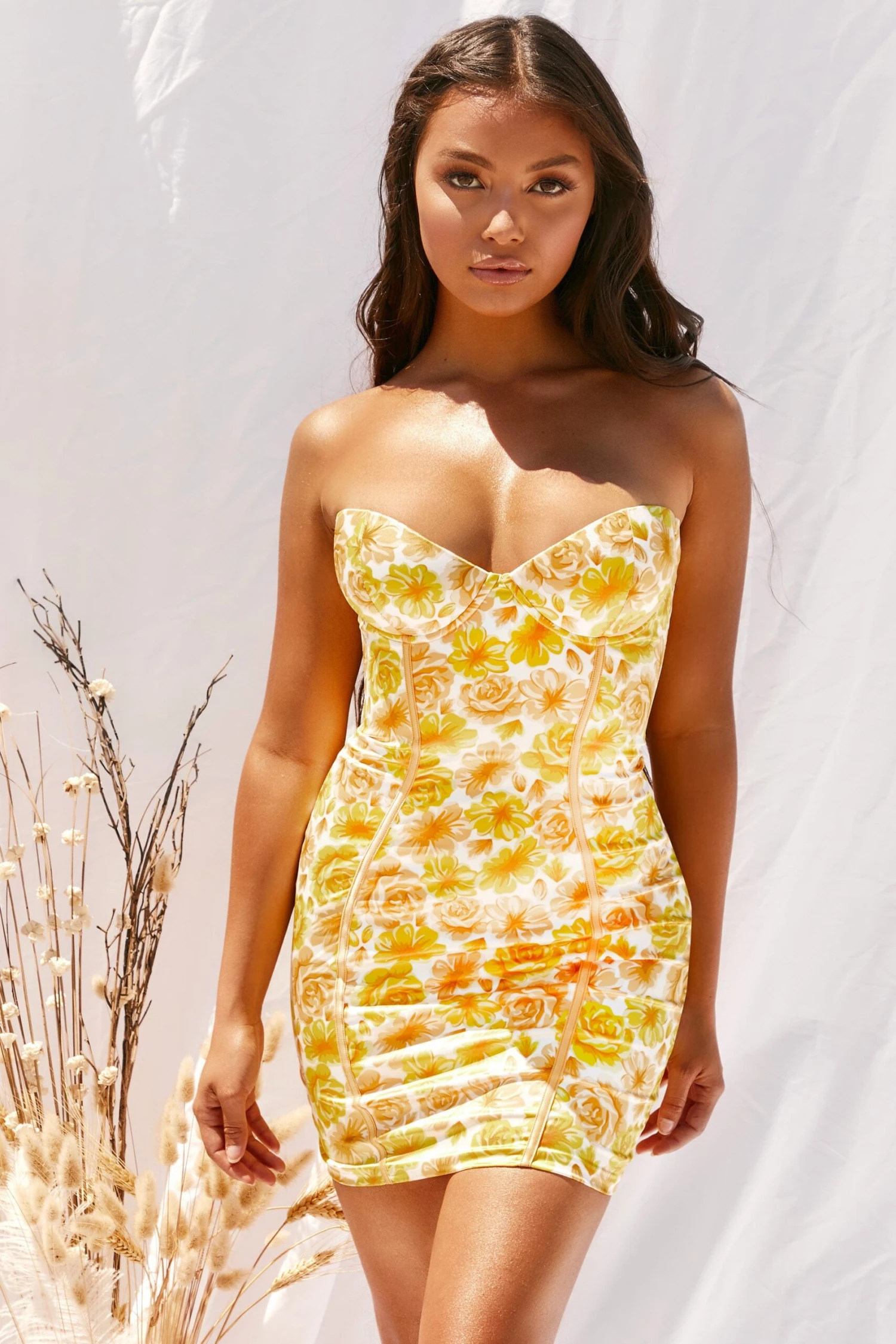 We are in love with the strapless design of our floral satin mini dress. Styled with underwired cups for a supportive bust-flattering fit. The contrast piping detail combined with the smooth satin fabric give that dreamy shape we know you love. Just add cute strappy heels and statement earrings for perfect sunny day style.